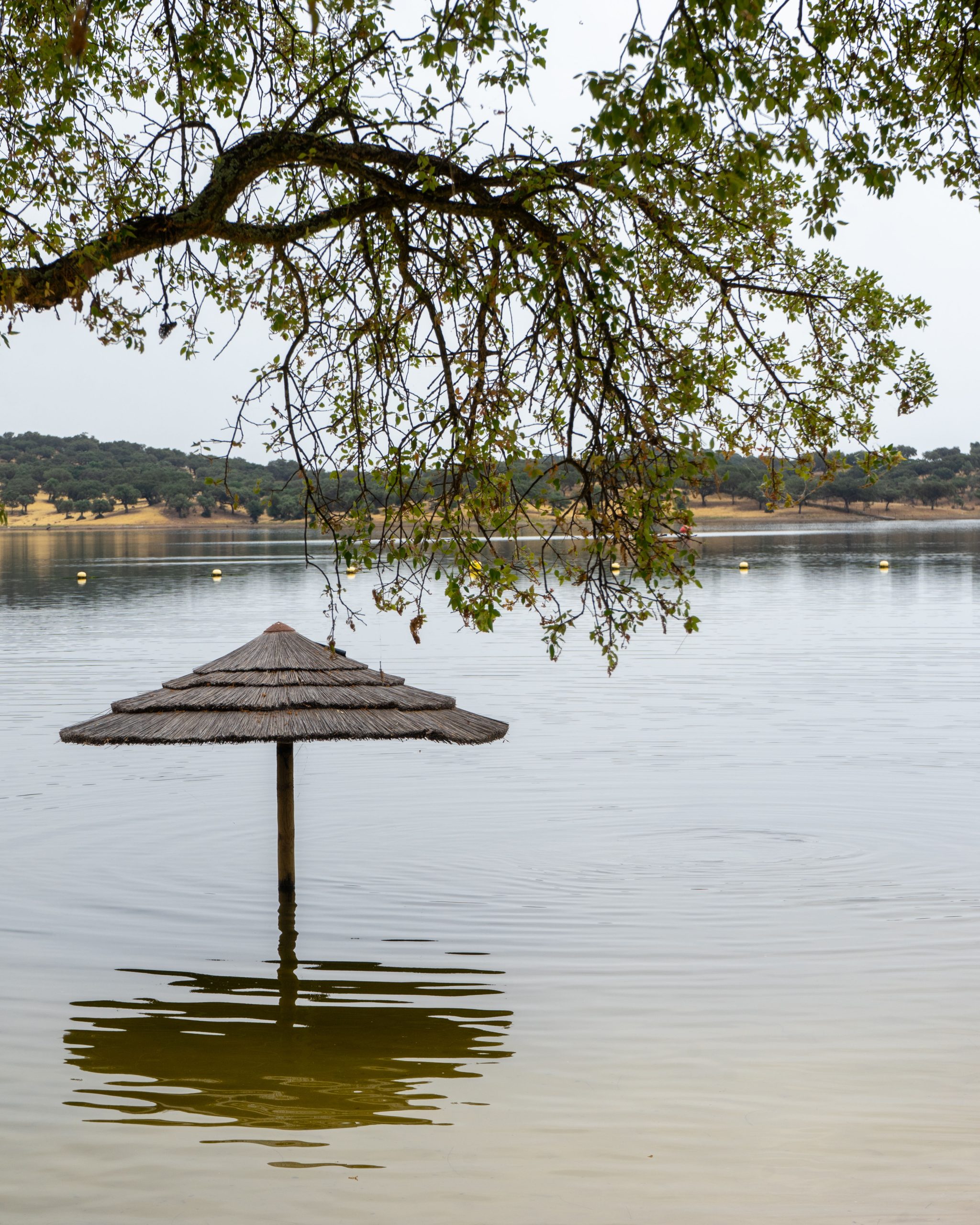 A superfície da água move-se devagar, com aquela calma que só existe nos grandes espelhos naturais. Não há ondas agitadas, não há ruído constante, apenas pequenas vibrações de luz que se transformam ao ritmo do vento. A margem mistura areia, relva e terra quente, criando uma transição suave entre o que é sólido e o que é fluido.