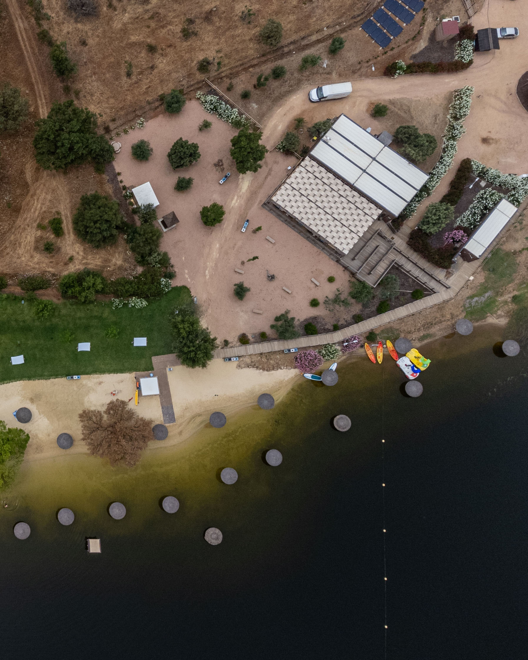 A luz reflete-se na água com uma intensidade quase líquida. O céu parece maior porque se duplica no lago. O som chega filtrado, distante, suave, como se cada movimento fosse absorvido pela dimensão do espaço.